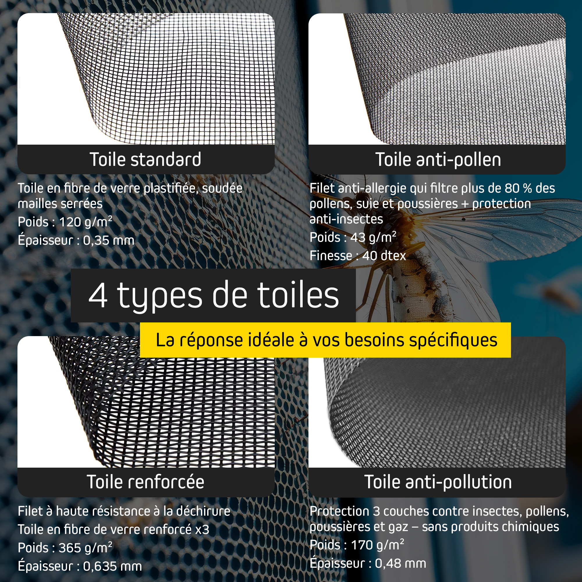 - 4 toiles moustiquaires au choix : Standard, Anti-pollen, Anti-particules fines, "Toile pour chats"
